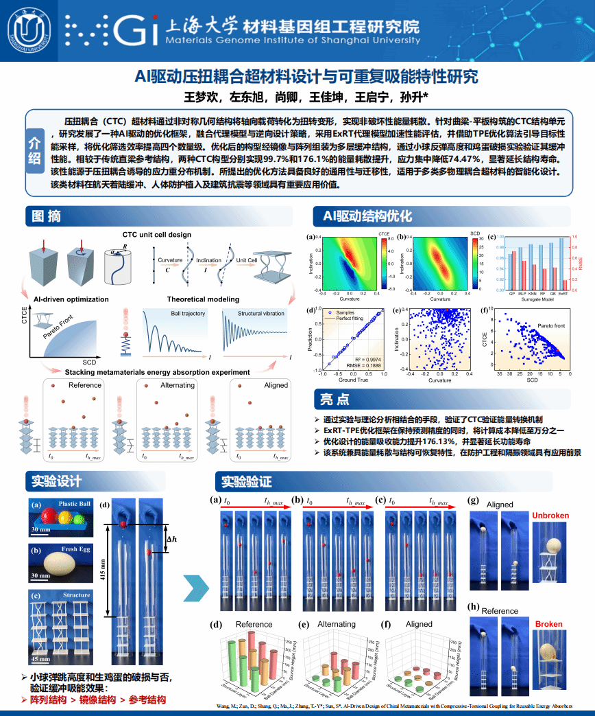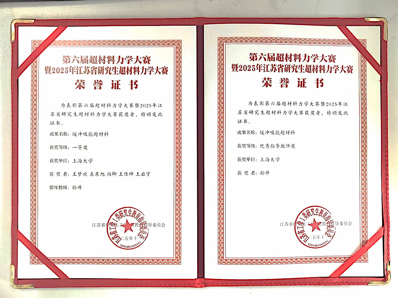 我院学生(王梦欢、左东旭、尚卿、王佳坤、王启宁)的参赛作品《缓冲吸能超材料》成功斩获一等奖,指导教师孙升荣获 “优秀指导教师奖”。该作品是材料基因组研发理念在超材料性能设计和优化上的成功应用,是“超材料基因组工程”研发方向上的新成果,工作通过整合AI赋能的加速计算和优化、有限元仿真、力学建模和实验验证,证明了“超材料基因组工程”研发范式在性能导向的力学超材料的快速迭代设计中的有效性。